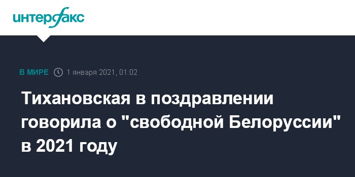 Минск. 1 января. INTERFAX.RU - Экс-кандидат в президенты Белоруссии Светлана Тихановская в новогоднем поздравлении, которое транслировалось в интернете, выразила надежду, что в 2021 году ее соотечественники будут жить в "свободной Беларуси".