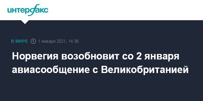Москва. 1 января. INTERFAX.RU - Норвегия снимает запрет на авиасообщение с Великобританией и возобновляет авиаперелеты со 2 января, сообщает в пятницу The Guardian.