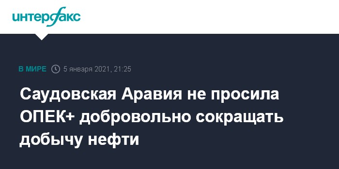 Москва. 5 января. INTERFAX.RU - Саудовская Аравия не просила членов соглашения ОПЕК+ о дополнительных добровольных сокращениях добычи нефти.
