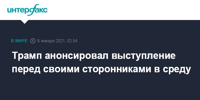 Москва. 6 января. INTERFAX.RU - Действующий президент США Дональд Трамп заявил, что выступит перед своими сторонниками, митингующими в Вашингтоне, в среду.