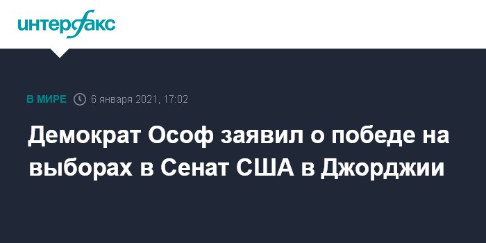 Москва. 6 января. INTERFAX.RU - Представитель Демократической партии Джон Ософ заявил в среду о победе на выборах в Сенат США от штата Джорджия, сообщает американский телеканал Fox News.