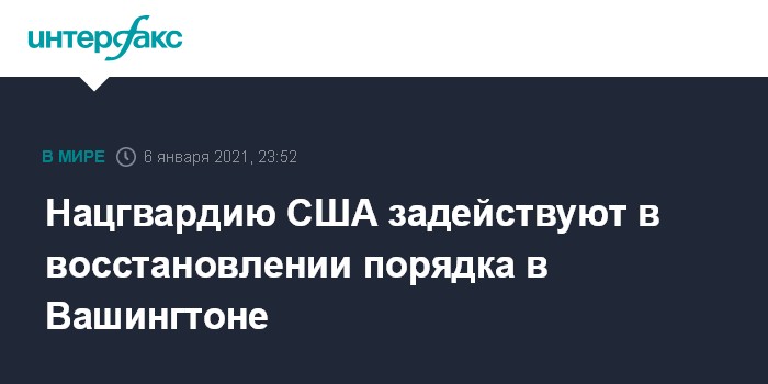 Москва. 6 января. INTERFAX.RU - Бойцы Национальной гвардии США прибудут в Вашингтон для участия в восстановлении порядка, сообщает телеканал CNBC со ссылкой на Белый дом.