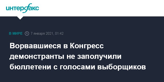 Москва. 7 января. INTERFAX.RU - Прорвавшиеся в здание Конгресса США демонстранты не смогли добраться до бюллетеней, поданных выборщиками на выборах президента страны, сообщил сенатор-демократ Джефф Меркли.