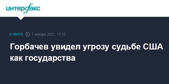 Москва. 7 января. INTERFAX.RU - Беспорядки в Вашингтоне минувшей ночью поставили вопрос о дальнейшей судьбе Соединенных Штатов как государства, заявил экс-президент СССР Михаил Горбачев.
