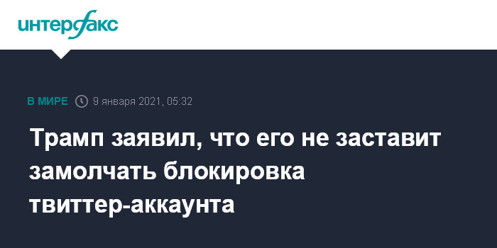 Москва. 9 января. INTERFAX.RU - Отключение компанией Twitter личного аккаунта Дональда Трампа не заставит его замолчать, сообщил Белый дом, ссылаясь на заявление президента.