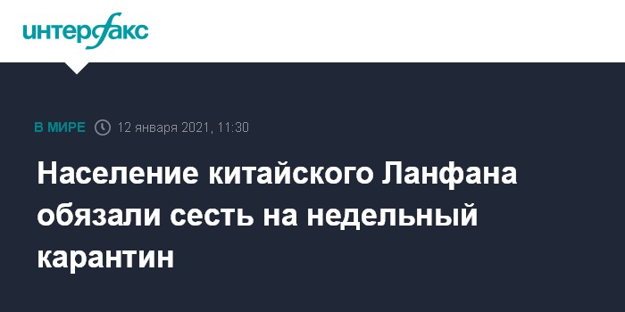 Москва. 12 января. INTERFAX.RU - В Китае в городе Ланфан выявили один случай заражения коронавирусом. В связи с этим все население города призвали на неделю самоизолироваться по домам, сообщили в Weibo чиновники местной администрации.