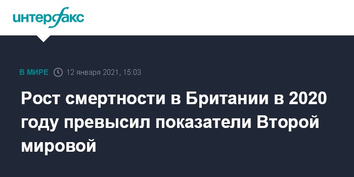Москва. 12 января. INTERFAX.RU - Рост смертности в Великобритании в 2020 году стал самым значительным за более чем 70 лет, сообщает "Би-би-си" со ссылкой на данные Национальной службы статистики страны.