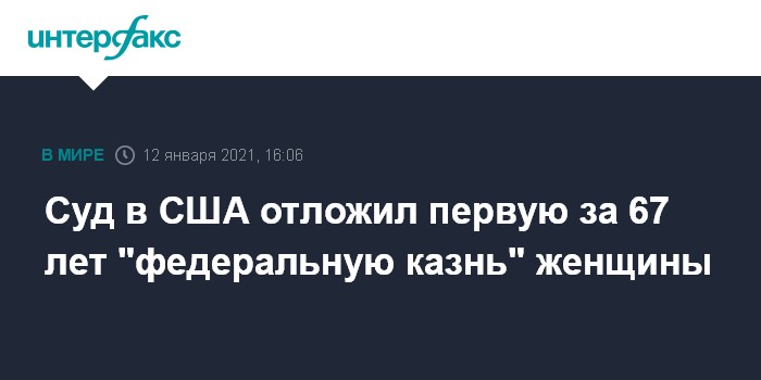 Москва. 12 января. INTERFAX.RU - В США 12 декабря должны были впервые за 67 лет казнить женщину, но судья отложил казнь, чтобы снова определить вменяемость осужденной, сообщает АР.