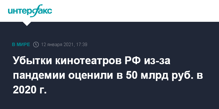 Москва. 12 января. INTERFAX.RU - Прямые убытки кинотеатров в России из-за ограничений в связи с пандемией коронавируса по итогам 2020 года составили 10 млрд рублей, всего кинотеатры потеряли около 50 млрд, сообщил "Интерфаксу" во вторник глава Ассоциации владельцев кинотеатров Олег Березин.