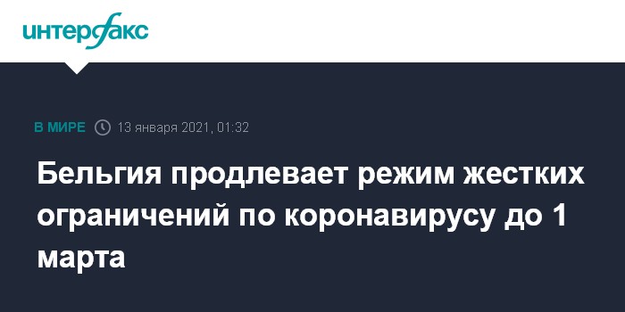 Москва. 13 января. INTERFAX.RU - Ограничения, введенные в Бельгии 2 ноября в связи со второй волной коронавирусной инфекции, как предполагалось, до 15 января, продлеваются до 1 марта, сообщили вечером во вторник бельгийские СМИ со ссылкой на правительственный вестник Moniteur belge.