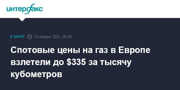 Москва. 13 января. INTERFAX.RU - Спотовые цены на газ в Европе за вторник выросли сразу на 18%, уверенно пробив отметку в $300 за тысячу кубометров - уровень цены на топливо, который, казалось, уже относится к другой исторической эпохе. Цены в Европе дорожают день ото дня с оглядкой на безумное ценовое ралли в Азии.