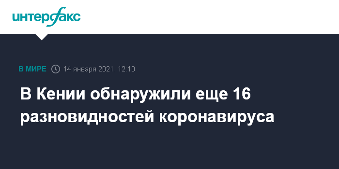 Москва. 14 января. INTERFAX.RU - Ученые из медицинского исследовательского института Кении обнаружили в стране 16 новых разновидностей коронавируса, сообщает в четверг кенийская газета Nation.