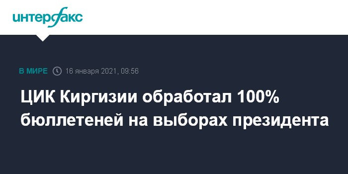 Москва. 16 января. INTERFAX.RU - Садыр Жапаров, после обработки 100% бюллетеней, побеждает на досрочных выборах президента Киргизии с 79,2% голосов, следует из данных, опубликованных на сайте ЦИК страны.