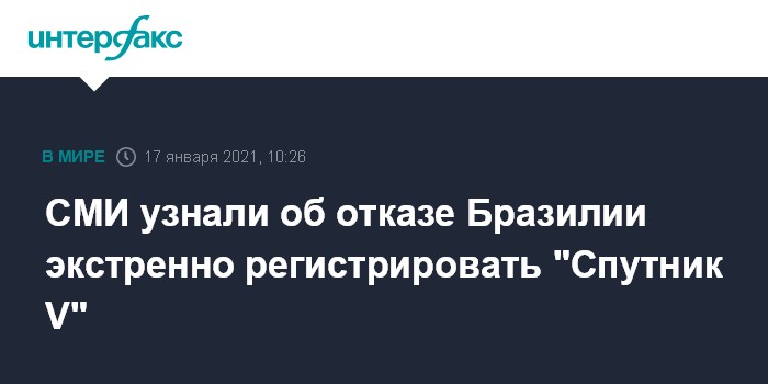 Москва. 17 января. INTERFAX.RU - Бразильское Национальное агентство по санитарному надзору Anvisa отклонило заявку компании Uniao Quimica на экстренное использование российской вакцины от коронавируса "Спутник V", сообщило в воскресенье издание The Guardian.