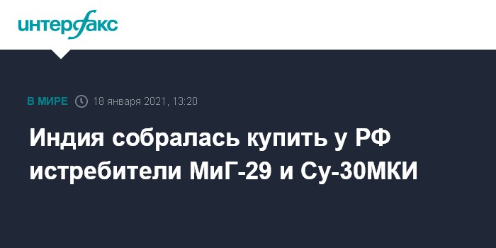 Москва. 18 января. INTERFAX.RU - Индийские власти официально заявили о намерении приобрести у России 21 истребитель МиГ-29 и 12 истребителей Су-30МКИ, пишет в понедельник индийская газета Times of India.