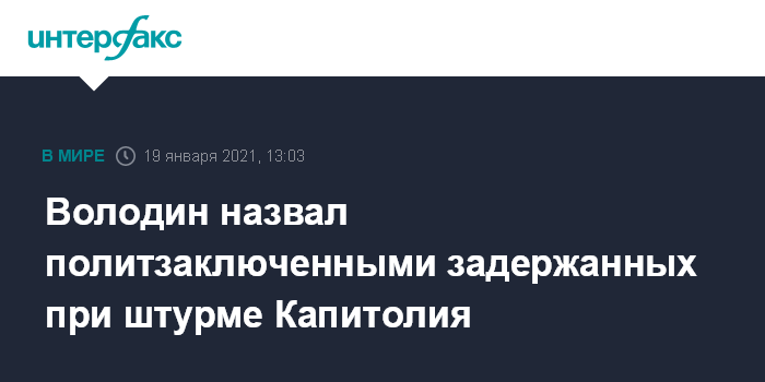 Москва. 19 января. INTERFAX.RU - Спикер Госдумы Вячеслав Володин назвал политзаключенными участников штурма Капитолия в Вашингтоне, которые были задержаны и которым грозит тюрьма. Он сказал это, открывая весеннюю сессию палаты.