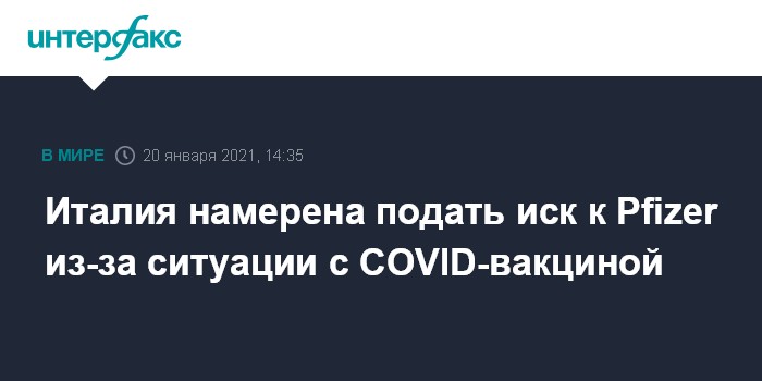 Москва. 20 января. INTERFAX.RU - Правительство Италии готово подать иск против компании Pfizer в связи с задержками при поставках вакцины от коронавируса COVID-19, сообщили в среду западные СМИ со ссылкой на заявление чрезвычайного комиссара Италии по борьбе с пандемией Доменико Аркури.