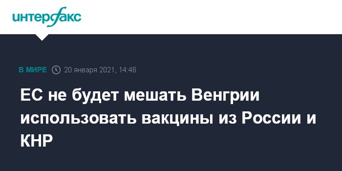 Москва. 20 января. INTERFAX.RU - Европейский совет не намерен вмешиваться в вопрос о намерении Венгрии использовать китайскую и российскую вакцины от коронавируса, поскольку этот вопрос находится в компетенции венгерского правительства, сообщил чиновник ЕС.