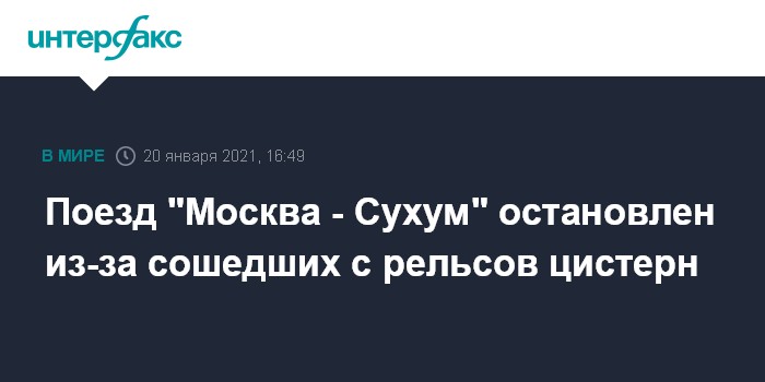 Москва. 20 января. INTERFAX.RU - Пассажирский поезд "Москва - Сухум" совершил вынужденную остановку в г. Новый Афон из-за того, что в селе Эшера Сухумского района с железнодорожного пути сошли несколько цистерн.