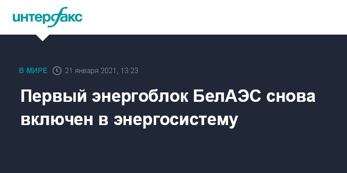 Москва. 21 января. INTERFAX.RU - Первый энергоблок Белорусской АЭС снова включен в энергосистему Белоруссии после отключения 16 января из-за срабатывания системы защиты генератора.
