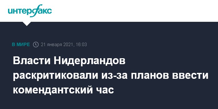 Москва. 21 января. INTERFAX.RU - Оппозиционные депутаты парламента Нидерландов подвергли критике намерение правительства в связи с ситуацией вокруг коронавируса COVID-19 объявить в стране комендантский час - с 20:30 по 4:30 местного времени, сообщает агентство Associated Press (AP).