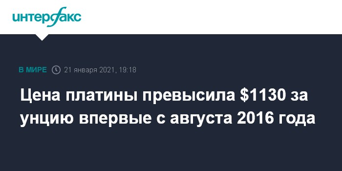 Москва. 21 января. INTERFAX.RU - С начала 2021 года платина подорожала на 6,5%. Ее цена превзошла отметку $1130 за унцию впервые более чем за четыре года - с августа 2016 года, сообщает Trading Economics.