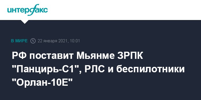 Москва. 22 января. INTERFAX.RU - Россия поставит Мьянме зенитные ракетно-пушечные комплексы "Панцирь-С1", беспилотные летательные комплексы "Орлан-10Е", а также радиолокационные станции.