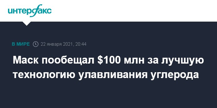 Москва. 22 января. INTERFAX.RU - Основатель и глава Tesla Inc. и SpaceX Илон Маск обещал приз в $100 млн за изобретение лучшей технологии улавливания углекислого газа.