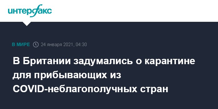 Москва. 24 января. INTERFAX.RU - Правительство Великобритании готовится ввести 10-дневный карантин для всех въезжающих из стран с высоким уровнем распространения коронавирусной инфекции, сообщило издание Daily Mail.