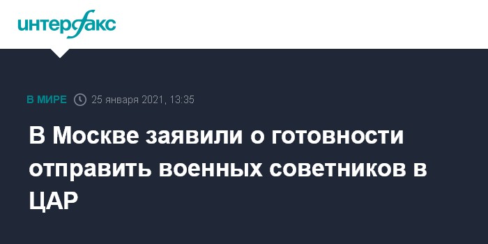 Москва. 25 января. INTERFAX.RU - Москва готова рассмотреть вопрос об отправке в Центральноафриканскую Республику военных советников, если такая просьба поступит, заявил в замминистра иностранных дел России Михаил Богданов.