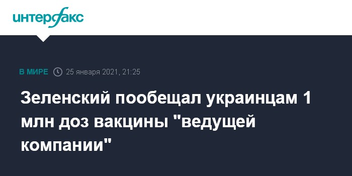 "Уже в феврале начнется вакцинация. Мы ожидаем, что вскоре в Украину поступит 1 млн доз вакцины. Первый миллион. От ведущей международной компании. Детали сможем озвучить в ближайшее время", - зсказалл Зеленский в видеообращении, обнародованном в телеграм-канале в понедельник.