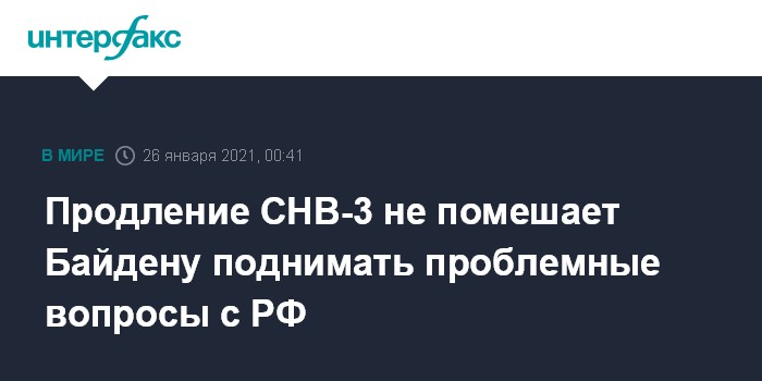 21 января пресс-секретарь Белого дома Джен Псаки заявила, что администрация Байдена предложит Москве продлить договор об СНВ-3 на пять лет. Пресс-секретарь президента РФ Дмитрий Песков 22 января сказал, что в Кремле приветствуют такое предложение, но официальная реакция поступит только после изучения деталей этой инициативы.