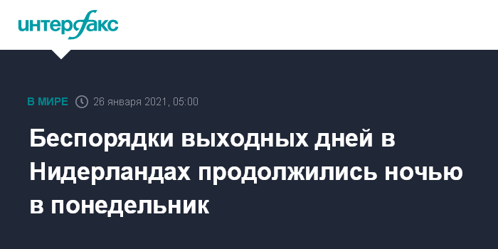 Москва. 26 января. INTERFAX.RU - В ряде городов Нидерландов сотни молодых людей в ночь на вторник устроили беспорядки, нападали на полицейских в знак протеста против введения жестких мер по борьбе с коронавирусом, сообщила местная полиция.