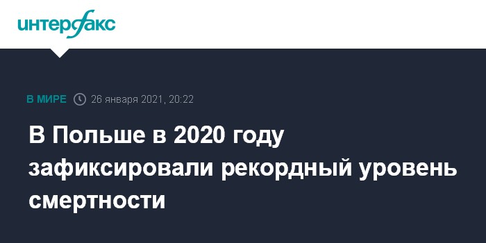Москва. 26 января. INTERFAX.RU - В Польше в 2020 году зафиксирован самый высокий уровень смертности за период со Второй мировой войны, при этом отмечается низкая рождаемость, сообщила во вторник газета Dziennik Gazeta Prawna со ссылкой на статистические данные.