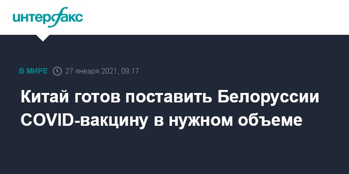 Москва. 27 января. INTERFAX.RU - Президент Белоруссии Александр Лукашенко и председатель КНР Си Цзиньпин обсудили в телефонном разговоре борьбу с пандемией коронавируса, Китай подтвердил готовность поставить в Беоруссию вакцину от COVID-19 в нужном объеме, говорится в сообщении госагентства БелТА во вторник.