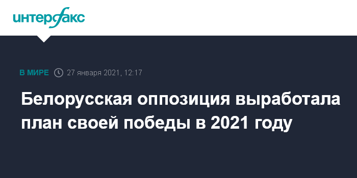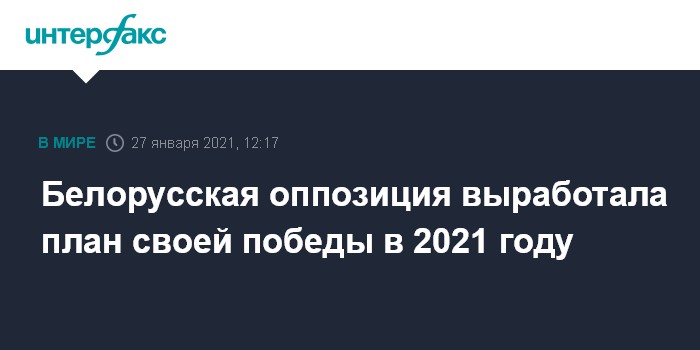 Москва. 27 января. INTERFAX.RU - Офис экс-кандидата в президенты Белоруссии Светланы Тихановской, Координационный совет оппозиции, Народное антикризисное управление, экс-претендент на пост президента Валерий Цепкало провели общую встречу и обсудили так называемый План победы-2021.