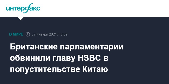 Москва. 27 января. INTERFAX.RU - Британские законодатели подвергли критике главного исполнительного директора HSBC Holdings Plc Ноэля Куинна в связи с позицией, которую занял банк, поддержавший введение Пекином закона о национальной безопасности для Гонконга.