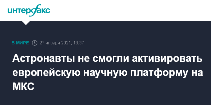 Москва. 27 января. INTERFAX.RU - Американские астронавты Майкл Хопкинс и Виктор Гловер в среду во время выхода в открытый космос с борта Международной космической станции (МКС) не смогли активировать работу научной платформы Bartolomeo на модуле Columbus Европейского космического агентства (ЕКА), сообщило НАСА.