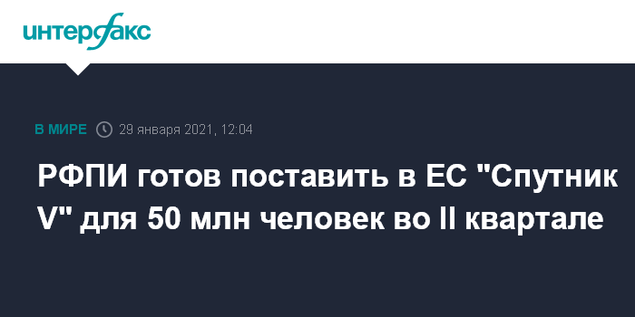 Москва. 29 января. INTERFAX.RU - Российский фонд прямых инвестиций (РФПИ) выразил готовность поставить в Евросоюз вакцину "Спутник V" для 50 млн человек во втором квартале текущего года.