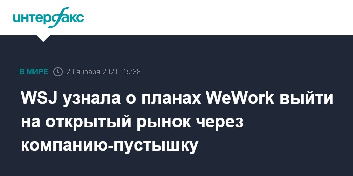 Москва. 29 января. INTERFAX.RU - Американский коворкинговый сервис WeWork может выйти на открытый рынок за счет объединения со специализированной компанией по слияниям и поглощениям (special purpose acquisition company, SPAC), пишет The Wall Street Journal со ссылкой на осведомленные источники.