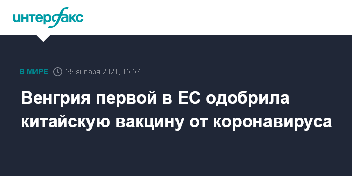 Москва. 29 января. INTERFAX.RU - Венгерское управление по надзору за продовольствием и медикаментами в пятницу одобрило вакцину от коронавируса китайской компании Sinopharm, таким образом, Венгрия первой из стран ЕС пошла на такой шаг, сообщают европейские СМИ.