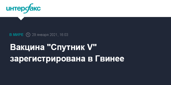 Москва. 29 января. INTERFAX.RU - Гвинея зарегистрировала российскую вакцину от коронавируса "Спутник V", сообщает Российский фонд прямых инвестиций (РФПИ).