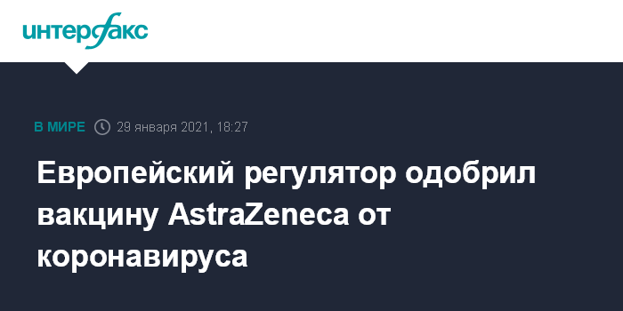 Москва. 29 января. INTERFAX.RU - Европейское агентство лекарственных средств (EMA) дало разрешение на применение вакцины производства англо-шведской компании AstraZeneca, говорится в пресс-релизе ведомства.