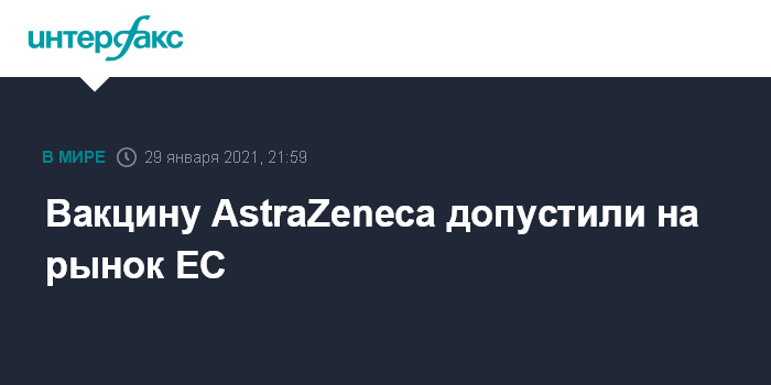 Москва. 29 января. INTERFAX.RU - Власти ЕС решили допустить до рыночного оборота в Евросоюзе вакцину разработки компании AstraZeneca против коронавируса COVID-19 - после ее одобрения Европейским агентством лекарственных средств (EMA), заявила председатель Еврокомиссии Урсула фон дер Ляйен.