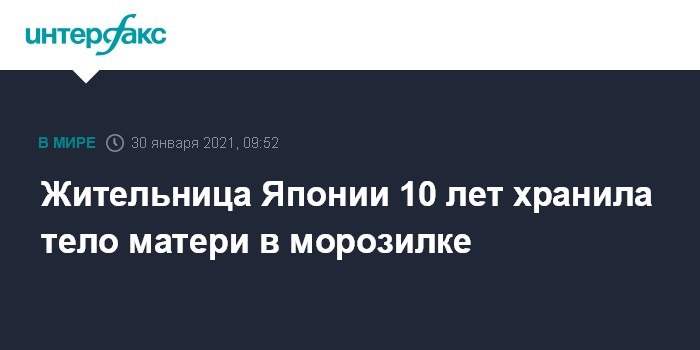 Москва. 30 января. INTERFAX.RU - Японская полиция арестовала женщину, в морозилке которой было найдено тело ее матери, сообщает "Би-би-си".