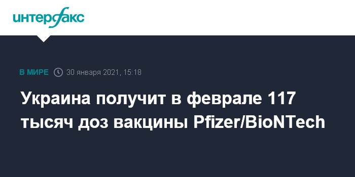 Москва. 30 января. INTERFAX.RU - Украина в рамках программы COVAX получит в феврале 117 тыс. доз вакцины Pfizer/BioNTech против коронавируса, сообщил замминистра здравоохранения, главный санитарный врач страны Виктор Ляшко.