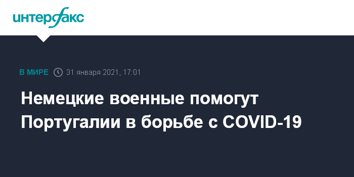 Москва. 31 января. INTERFAX.RU - Бундесвер отправит в Португалию медицинский персонал и оборудование, поскольку в отделениях реанимации португальских больниц заканчиваются места из-за резкого роста случаев заражения коронавирусом, сообщило в воскресенье Минобороны Германии.