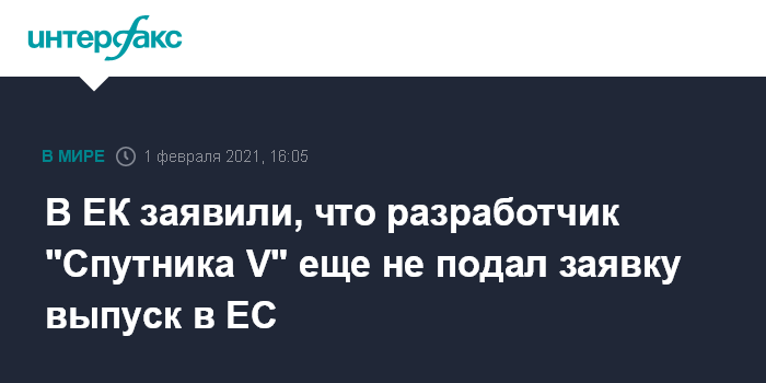 Москва. 1 февраля. INTERFAX.RU - Российский разработчик вакцины "Спутник V" против COVID-19 контактирует с Европейским агентством лекарственных средств (EMA), но заявки на ее коммерческое использование в Евросоюзе до сих пор не подал, сообщил официальный представитель Еврокомиссии (ЕК) Стефан де Кеерсмакер.