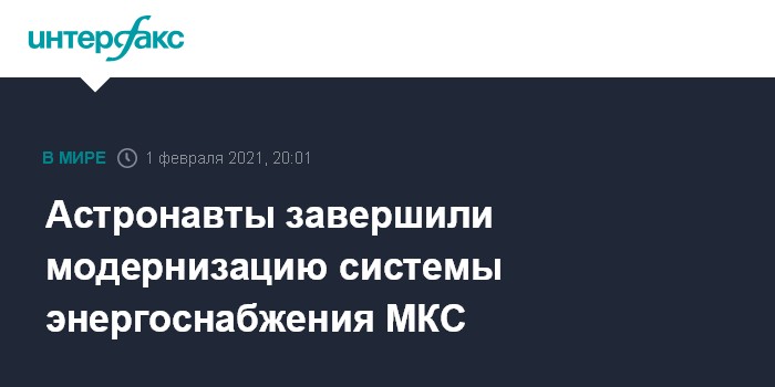Москва. 1 февраля. INTERFAX.RU - Американские астронавты Майкл Хопкинс и Виктор Гловер в понедельник в ходе выхода в космический вакуум с борта Международной космической станции (МКС) завершили работы по модернизации системы ее энергоснабжения, а также установили на ее внешней стороне новые видеокамеры высокого разрешения, сообщило НАСА.