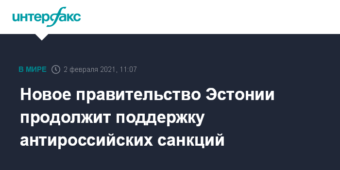 Москва. 2 февраля. INTERFAX.RU - Приступившее 26 января к деятельности новое правительство Эстонии продолжит прежний внешнеполитический курс и будет поддерживать санкции против России, заявила министр иностранных дел Эва-Мария Лииметс (Eva-Maria Liimets).
